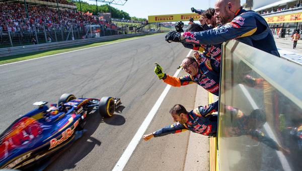 Феноменальный уик-энд для австрийского коллектива Red Bull! Неужели черная полоса неудач, сходов и поражений позади? По результатам Гран-при Венгрии невозможно сделать другого вывода. Ещё в пятницу в первой сессии свободных заездов пилоты Red Bull Даниил Квят и Даниэль Риккьярдо закрепились за лидерами чемпионата. По словам Даниэля, именно новые двигатели дали возможность навязать борьбу сильнейшим соперникам. В квалификации темп быков снизился, Риккьярдо расположился за тройкой лидеров, а Квят, не сумев найти ритм и почувствовать машину, установил 7-ое время. Гонка для пилотов получилась непростой. По ходу дистанции гонщики вели активную борьбу в первой 10-ке, в которой Даниэль несколько раз дошел до столкновений. Даниил испытывал проблемы с шинами medium, но вовремя поставленный комплект soft улучшил ситуацию, и Квят стал обходить соперников. На рестарте Даниэль обошел Льюиса, а на последних кругах гонки Риккьярдо начал прессинговать Росберга. В борьбе с Нико Даниэль обошел немца, но из-за поврежденного крыла не смог побороться за первое место. Даниил тем временем проскользнул мимо напарника и занял 2-ю позицию. Несмотря на штраф в 10 секунд из-за выезда за пределы трассы, Даниил Квят сохранил 2-ое место и в первый раз в своей карьере поднялся на подиум! Даниэль Риккьярдо финишировал следом. Комментарии пилотов и руководителя команды: