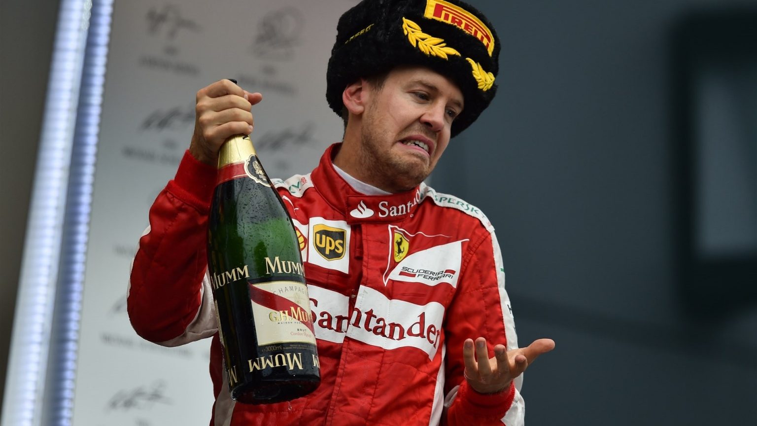 Гонка для Себастьяна и Кими сложилась по-разному. Немец вместе с командой воспользовались верной стратегией, и за счет удачной игры с пит-стопами опередили сначала Боттаса, а затем Переса. Догнать лидера, по словам Феттеля, не было возможным, второе место – максимум для итальянской конюшни. В 11-ый раз в текущем сезоне Себастьян поднялся на подиум, и, видимо, ему не особо понравился предложенный напиток…может, четырехкратный ждал от русских чего-нибудь «погорячее»?