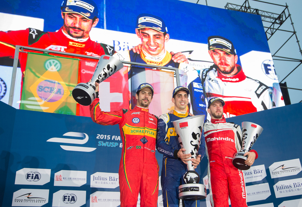 На подиум в Китае поднялись представители трех разных команд: Себастьян Буэми (Renault e.Dams) , Лукас Ди Грасси (ABT) и Ник Хайдфельд (Mahindra).