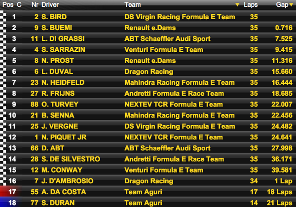 Лидер чемпионата Себастьен Буэми начал гонку с последнего места. С первых же кругов гонщик начал отыгрывать позиции и после обязательного пит-стопа по смене машины оказался на 4-ой строчке. Fan Boost пилоту не достался, но это не помешало Буэми обойти соперников и закрепиться на 2-ом месте. За несколько кругов до финиша завязалась красивейшая и захватывающая борьба между Себастьеном и лидером гонки Сэмом Бёрдом, в которой победу одержал второй. По ходу гонки Буэми отыграл 17 позиций, таким образом, пилот сохранил лидерство в личном зачете.