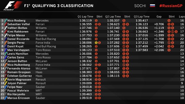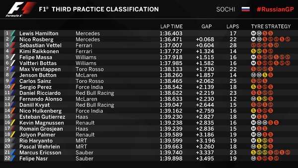 Williams имеют все шансы на подиум в воскресной гонке. Валттери Боттас и Фелипе Масса показали близкие к лидерам времена: Боттас занял 3-ю строчку, но завтра стартует с 1-го ряда, а Фелипе Масса с 5-м временем на решетке будет 4-м.